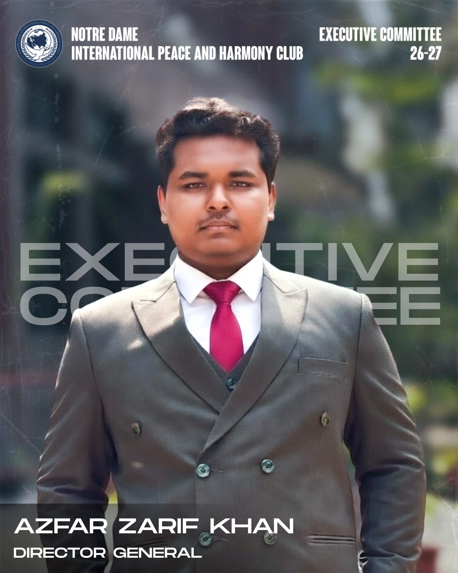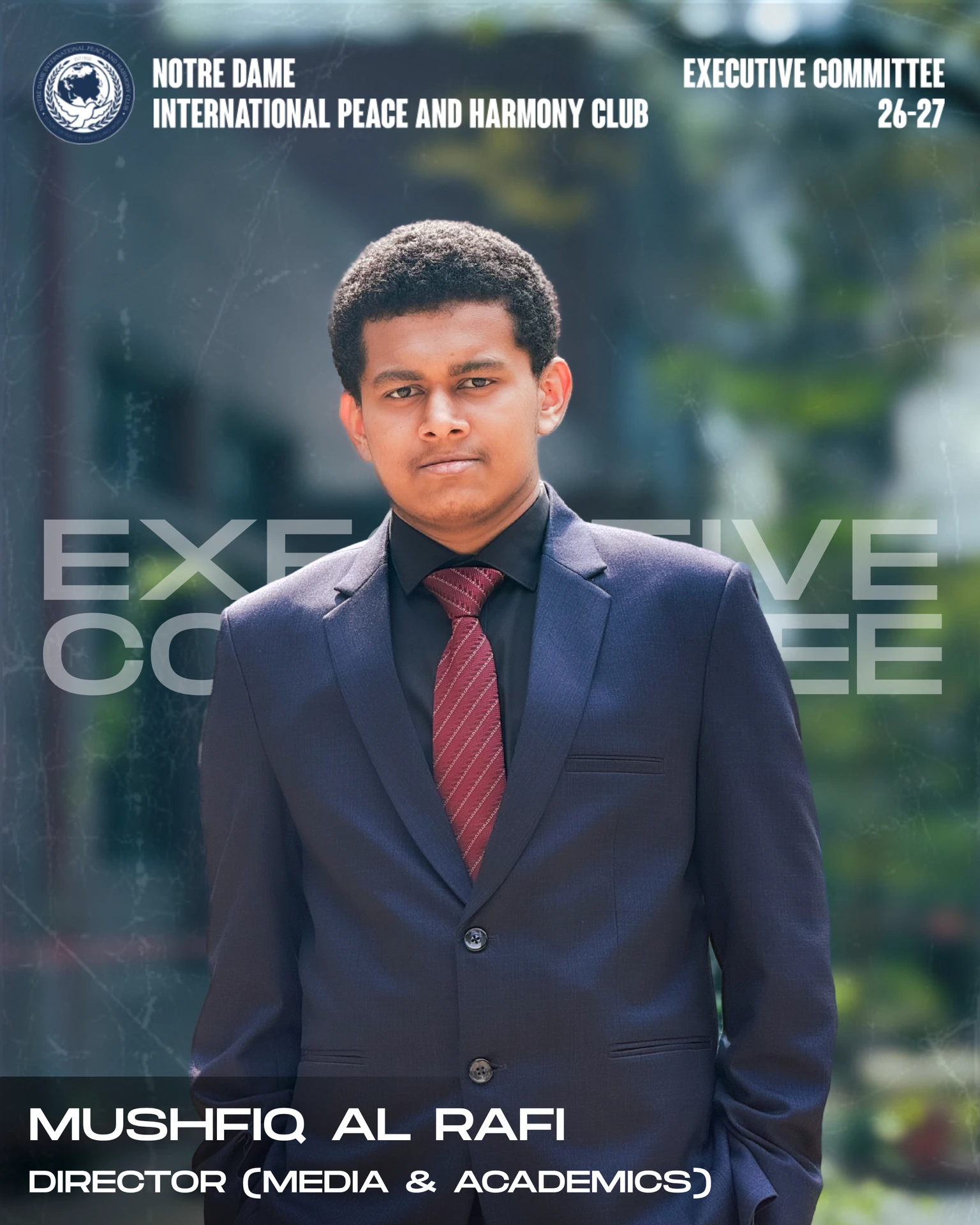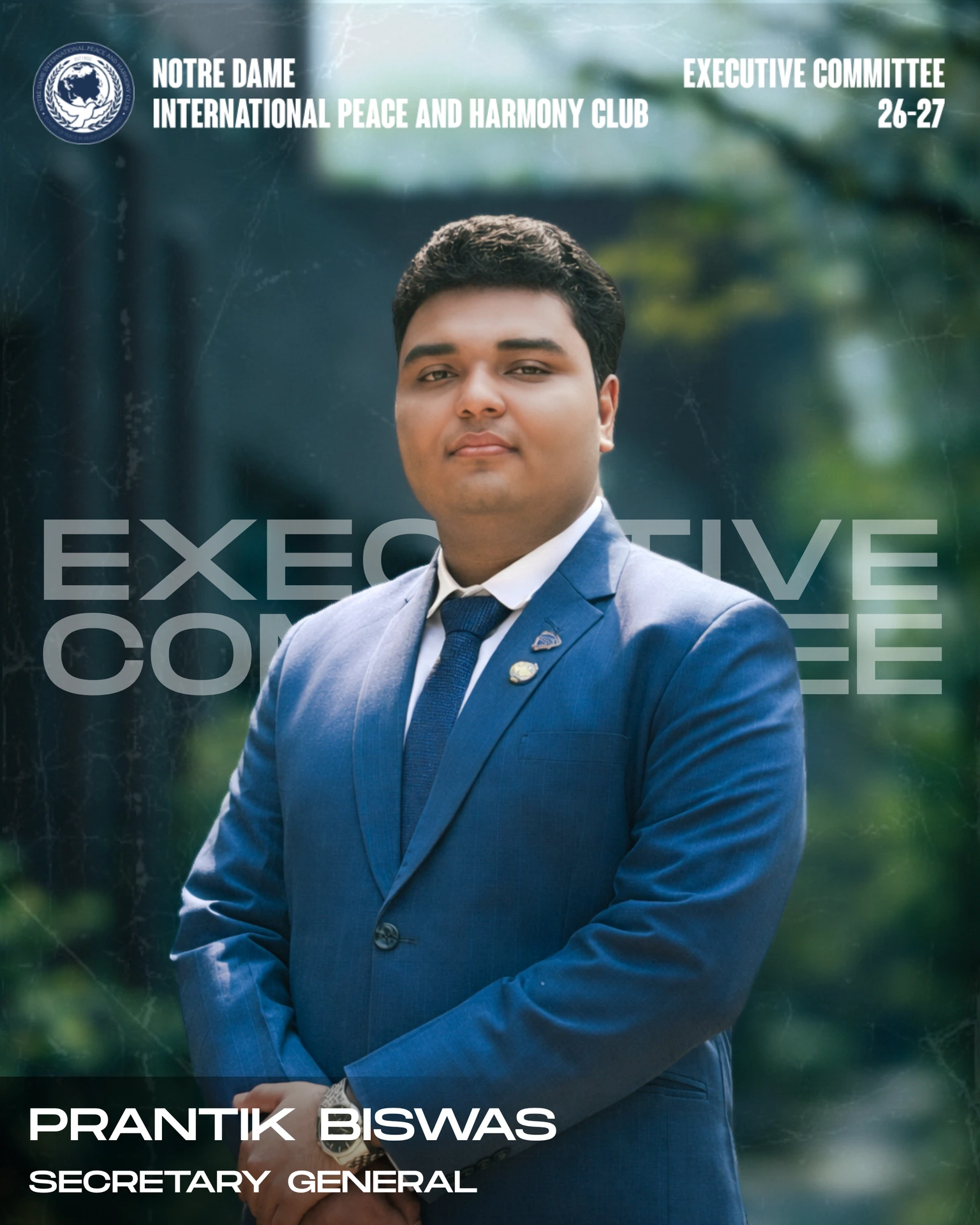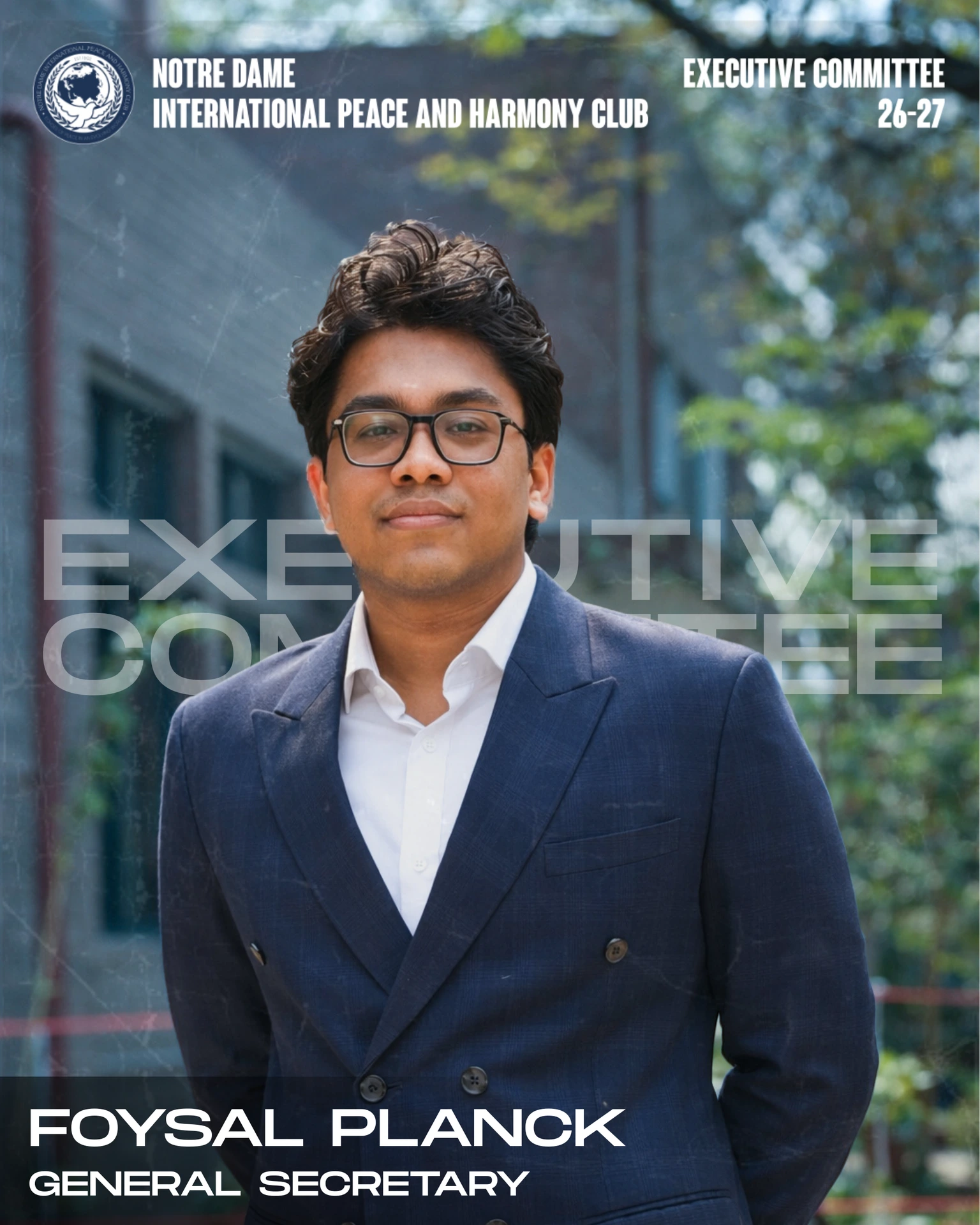 The Notre Dame International Peace and Harmony Club (NDIPHC) — formerly known as NDIURC — has officially announced its Executive Committee for the 2026–2027 session. Mostafa Tahmeed Foysal Planck has been named General Secretary of the club and Prantik Biswas as the Secretary General, heading a 14-member board committed to advancing the club's mission: "Echoes of Peace in an Evolving World."