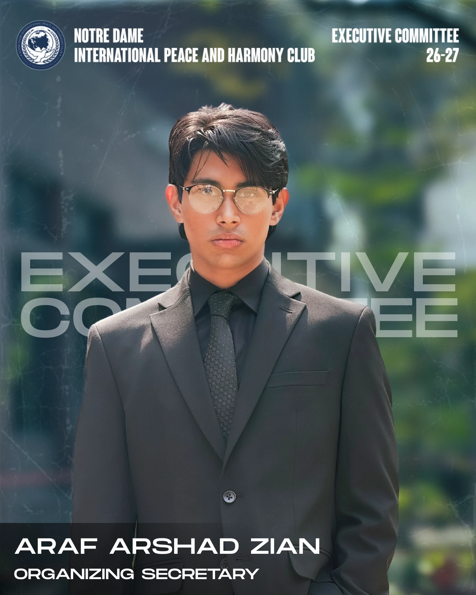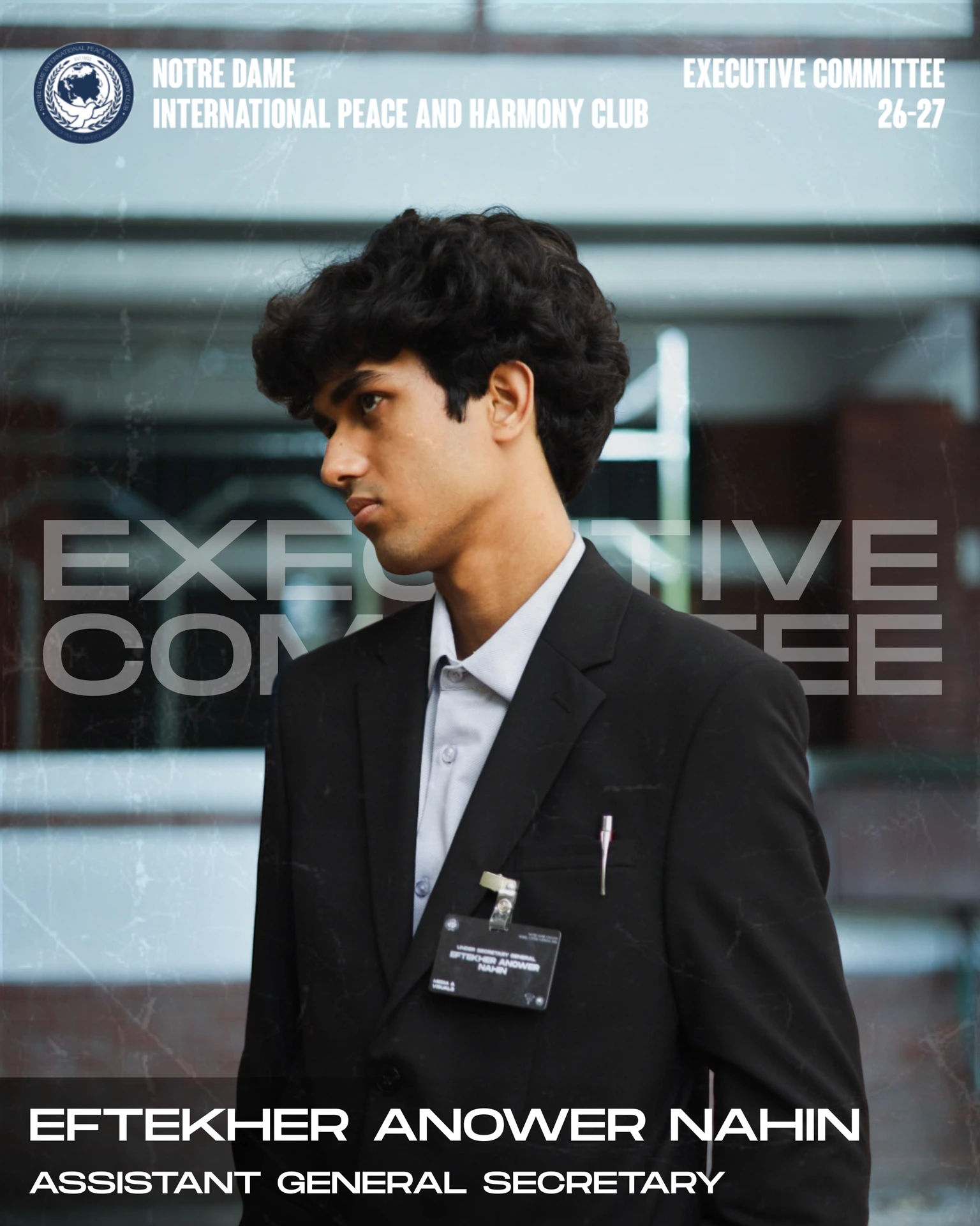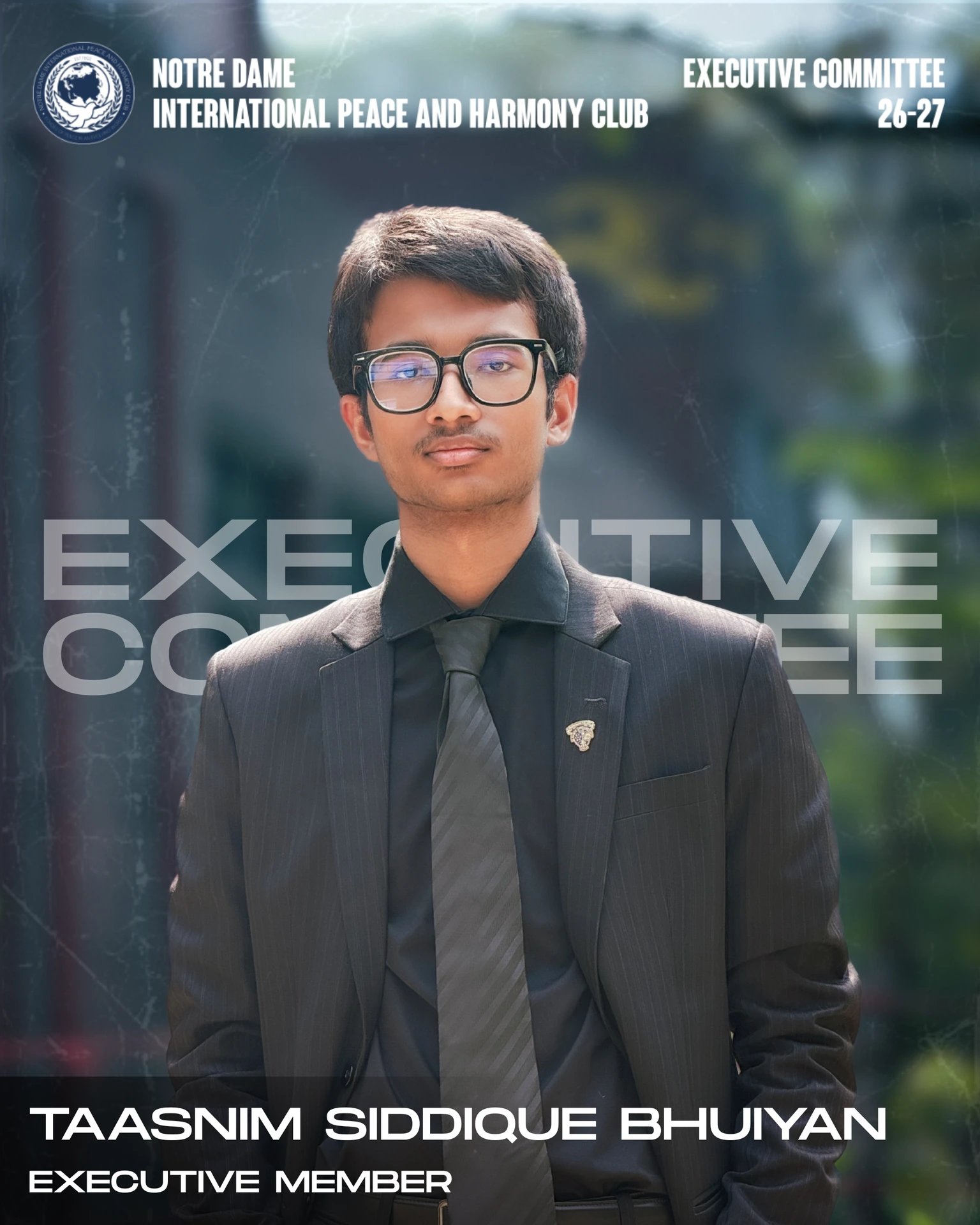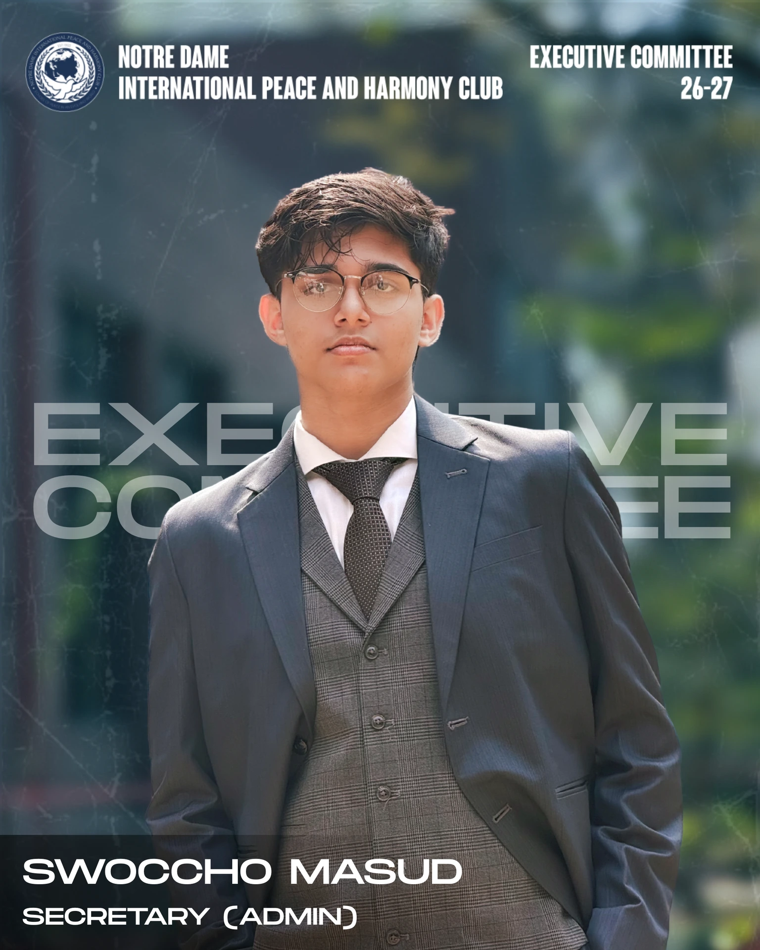 The Notre Dame International Peace and Harmony Club (NDIPHC) — formerly known as NDIURC — has officially announced its Executive Committee for the 2026–2027 session. Mostafa Tahmeed Foysal Planck has been named General Secretary of the club and Prantik Biswas as the Secretary General, heading a 14-member board committed to advancing the club's mission: "Echoes of Peace in an Evolving World."