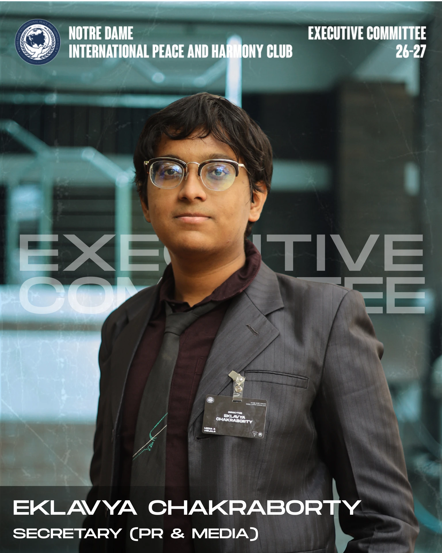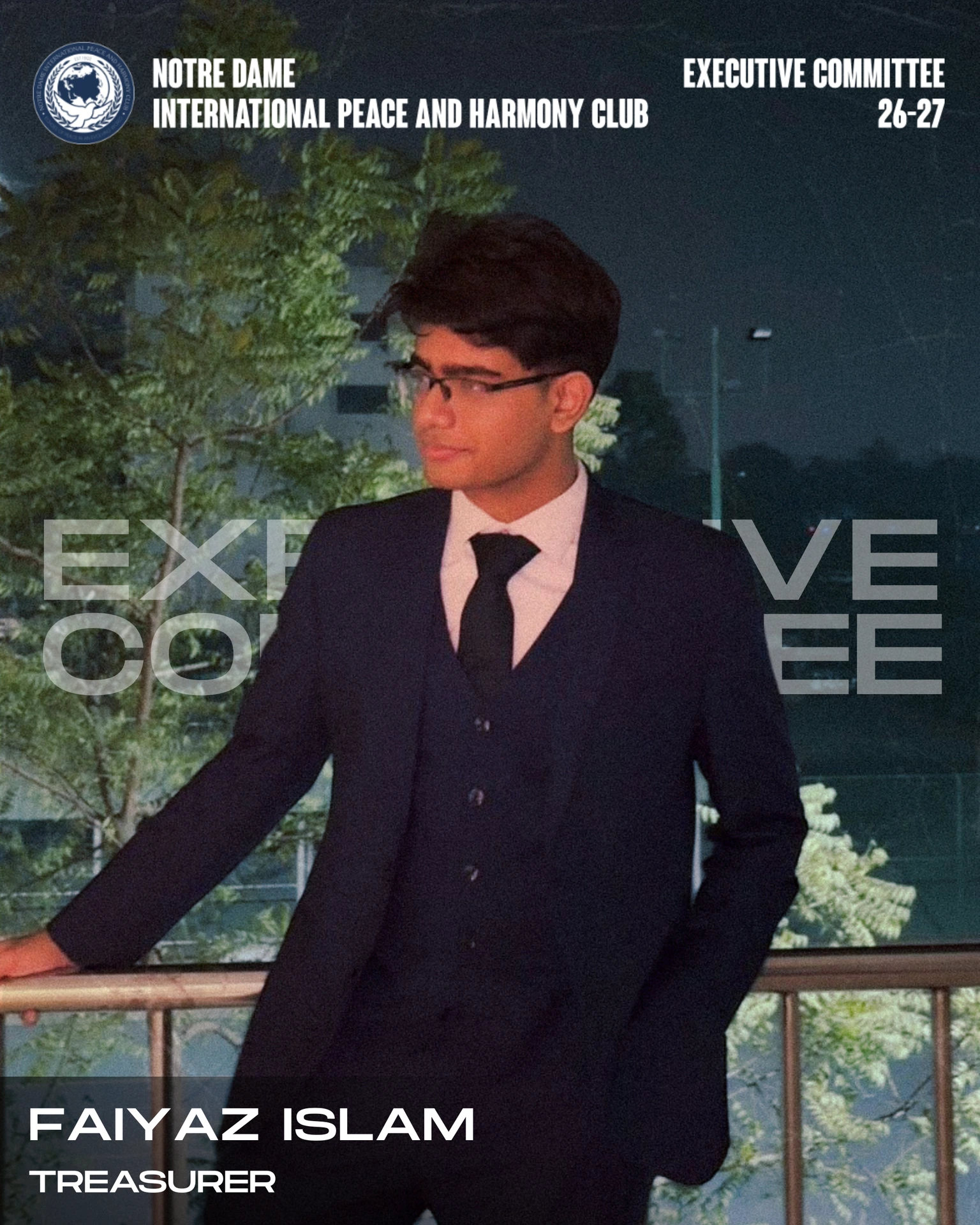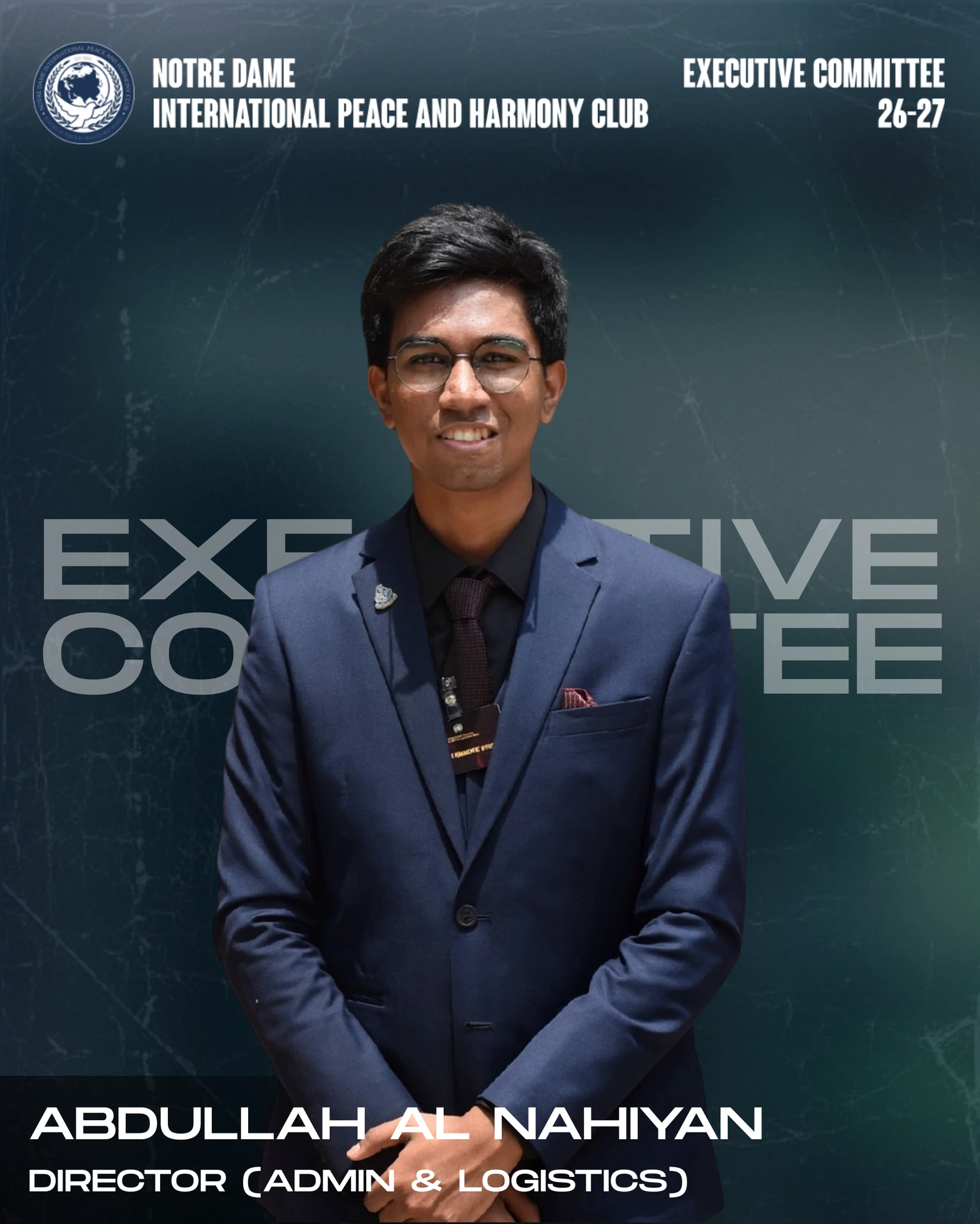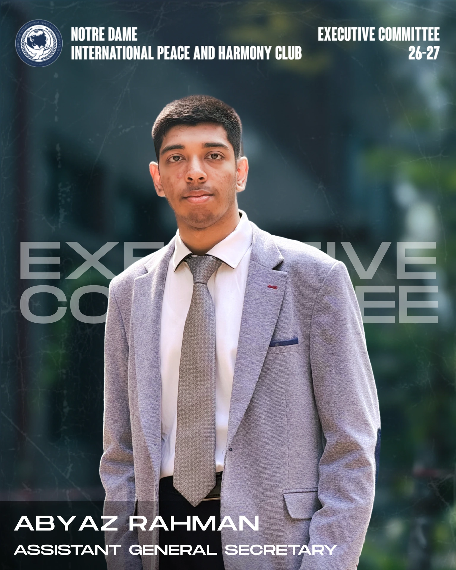 The Notre Dame International Peace and Harmony Club (NDIPHC) — formerly known as NDIURC — has officially announced its Executive Committee for the 2026–2027 session. Mostafa Tahmeed Foysal Planck has been named General Secretary of the club and Prantik Biswas as the Secretary General, heading a 14-member board committed to advancing the club's mission: "Echoes of Peace in an Evolving World."
